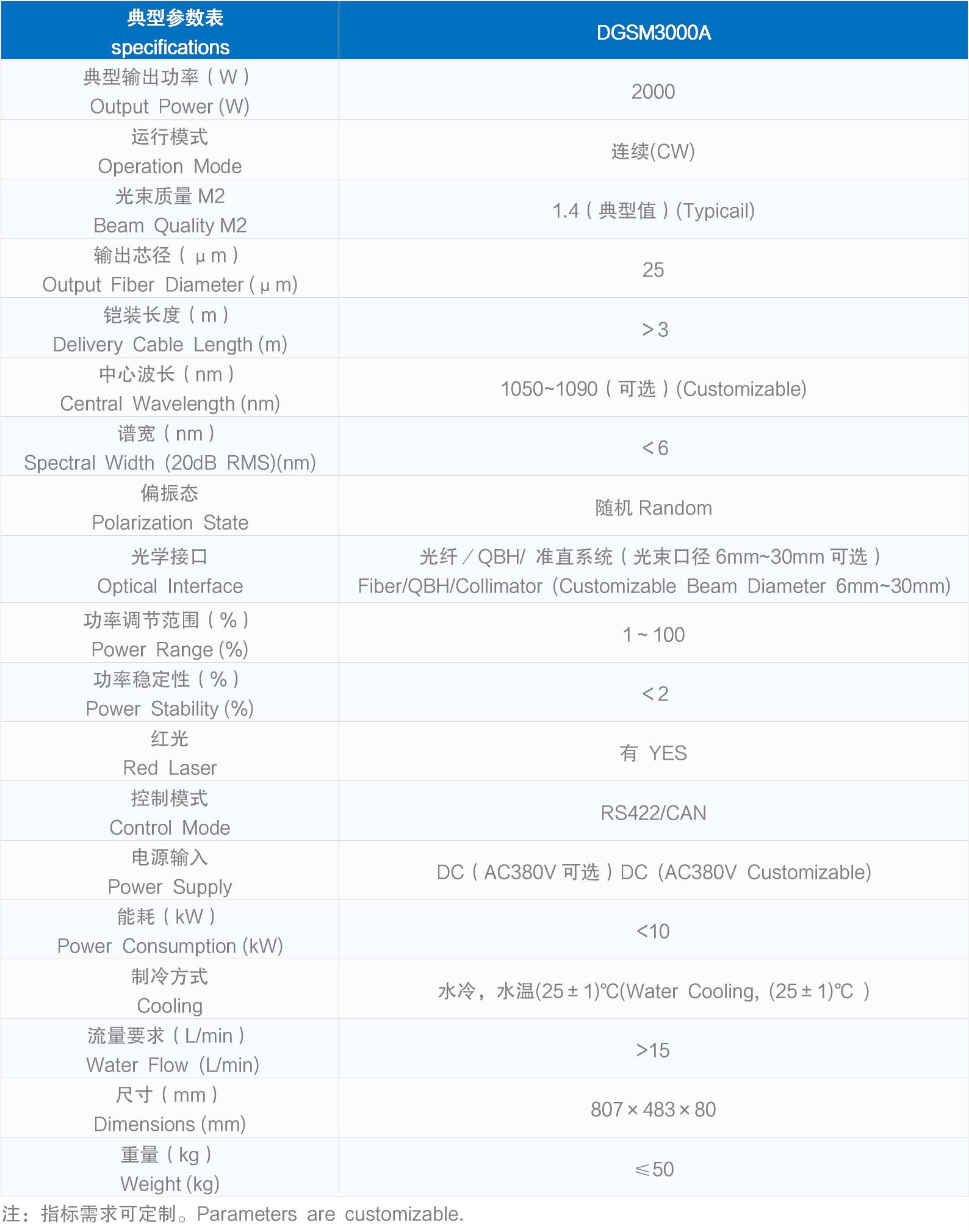 光学接口 Optical Interface | 光纤/QBH/ 准直系统(光束口径6mm~30mm可选) Fiber/QBH/Collimator (Customizable Beam Diameter 6mm~30mm) | |